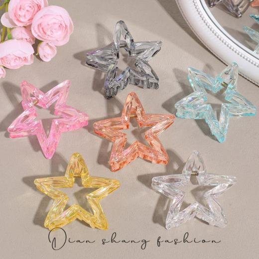 Design: Fashionable hollow five-pointed star (pentagram) shape. Material: High-transparency, durable plastic or resin material with a shiny, crystal/holographic finish. Style: Trendy Korean style, Y2K aesthetic, dopamine-inspired, and versatile for various occasions. Hold: Strong grip claw clip for secure, no-slip hair fixing. Versatility: Ideal for creating full updos, half-up styles, or as a side clip. Colors: Available in multiple vibrant, gradient, or candy colors (e.g., pink, blue, clear, amber). Comfort: Lightweight design ensures comfortable all-day wear.