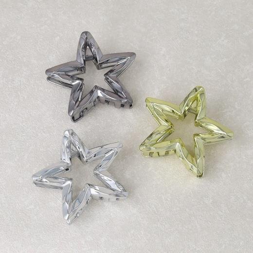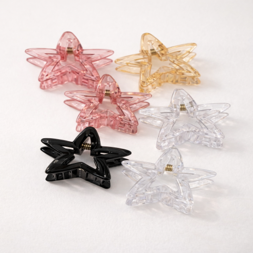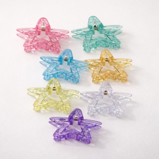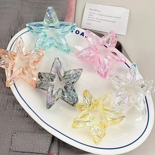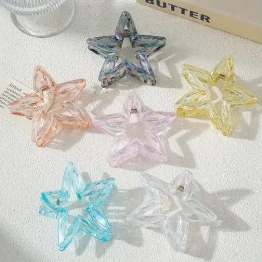 Design: Fashionable hollow five-pointed star (pentagram) shape. Material: High-transparency, durable plastic or resin material with a shiny, crystal/holographic finish. Style: Trendy Korean style, Y2K aesthetic, dopamine-inspired, and versatile for various occasions. Hold: Strong grip claw clip for secure, no-slip hair fixing. Versatility: Ideal for creating full updos, half-up styles, or as a side clip. Colors: Available in multiple vibrant, gradient, or candy colors (e.g., pink, blue, clear, amber). Comfort: Lightweight design ensures comfortable all-day wear.